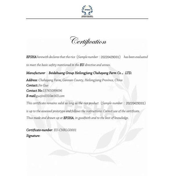 5月7日,查哈陽農場接到了歐洲食品安全與健康協會食品安全檢測中心發來的檢測證書,該場產區的3個品種的大米樣品通過了歐洲食品安全規定的所有747項檢測指標,這標志著查哈陽大米成為中國第一個,也是現在唯一可以正式進入歐盟市場的國產大米,也意味著中國擁有了第一款世界食品安全等級最高的大米,查哈陽大米獲得走向世界的通行證。