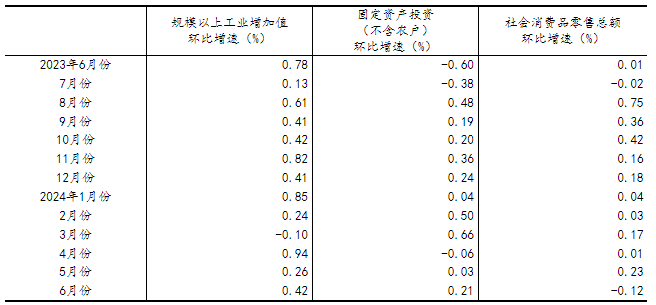 (2)根據季節調整模型自動修正結果,對近一年來各期國內生產總值、規模以上工業增加值、固定資產投資(不含農戶)、社會消費品零售總額環比增速進行修訂。修訂結果及2024年二季度GDP環比數據、2024年6月份其他指標環比數據如下: