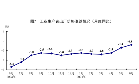 上半年,全國工業生產者出廠價格同比下降2.1%,降幅比一季度收窄0.6個百分點。其中,6月份同比下降0.8%,環比下降0.2%。上半年,工業生產者購進價格同比下降2.6%。其中,6月份同比下降0.5%,環比上漲0.1%。