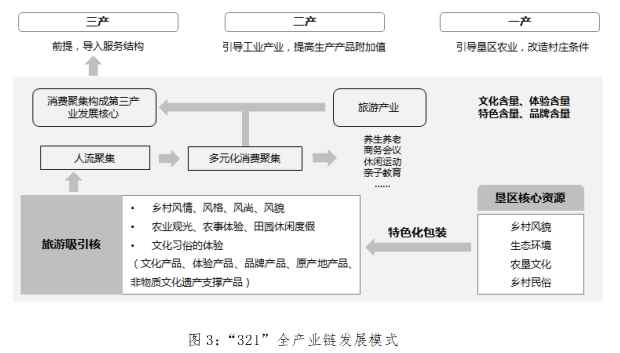 因此,農(nóng)墾系統(tǒng)的“321”全產(chǎn)業(yè)鏈發(fā)展模式,強(qiáng)調(diào)三產(chǎn)之間的互動(dòng)效率和產(chǎn)業(yè)能力提升。這一模式以墾區(qū)核心資源的分析挖掘?yàn)槠瘘c(diǎn),通過(guò)對(duì)資源的特色化、產(chǎn)品化包裝形成旅游產(chǎn)業(yè)的吸引物、吸引核,以聚集人氣,形成旅游引導(dǎo)的消費(fèi)聚集,并轉(zhuǎn)化為消費(fèi)產(chǎn)業(yè)的就業(yè)供給側(cè)聚集,最終形成以旅游產(chǎn)業(yè)為核心的三產(chǎn)服務(wù)結(jié)構(gòu),進(jìn)而引導(dǎo)加工產(chǎn)業(yè)發(fā)展,帶動(dòng)墾區(qū)農(nóng)業(yè)轉(zhuǎn)型,形成產(chǎn)業(yè)發(fā)展的可持續(xù)結(jié)構(gòu)。