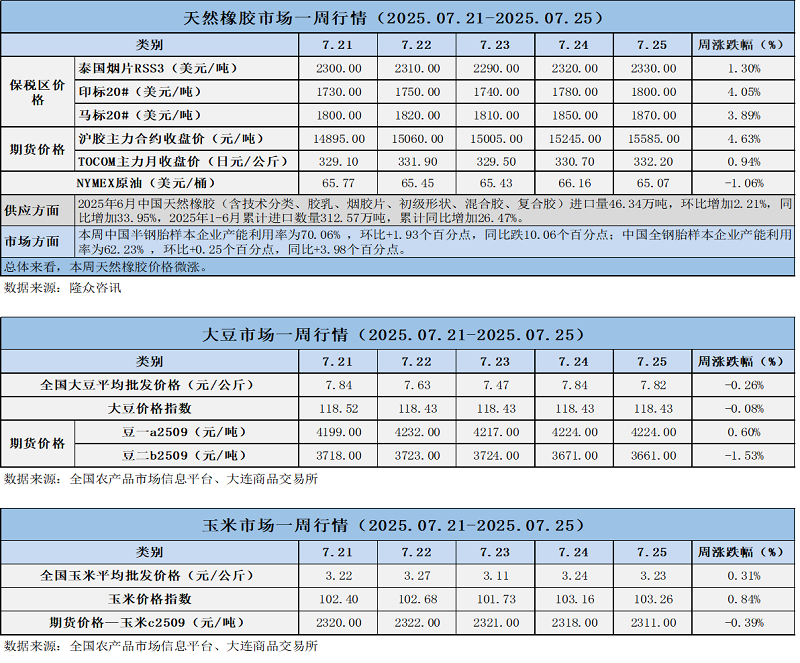 天然橡膠、大豆、玉米市場一周行情(2025.07.21-07.25)