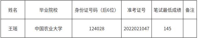 我單位2022年度公開招聘應屆畢業生面試人選確認工作已經結束,因技術推廣處農業技術推廣工作職員(20222001)有考生因個人原因自愿放棄面試資格。現按照筆試成績由高到低的順序進行遞補,遞補人選名單如下: