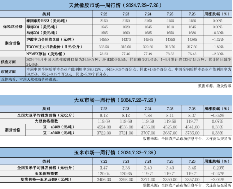 天然橡膠、大豆、玉米市場一周行情(2024.07.22-07.26)
