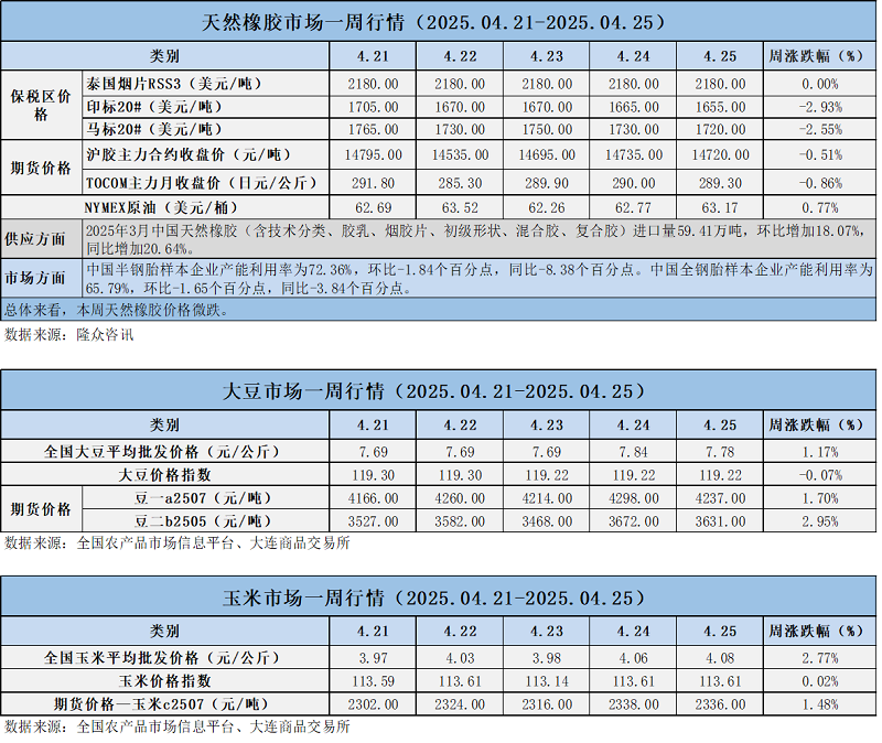 天然橡膠、大豆、玉米市場一周行情(2025.04.21-04.25)