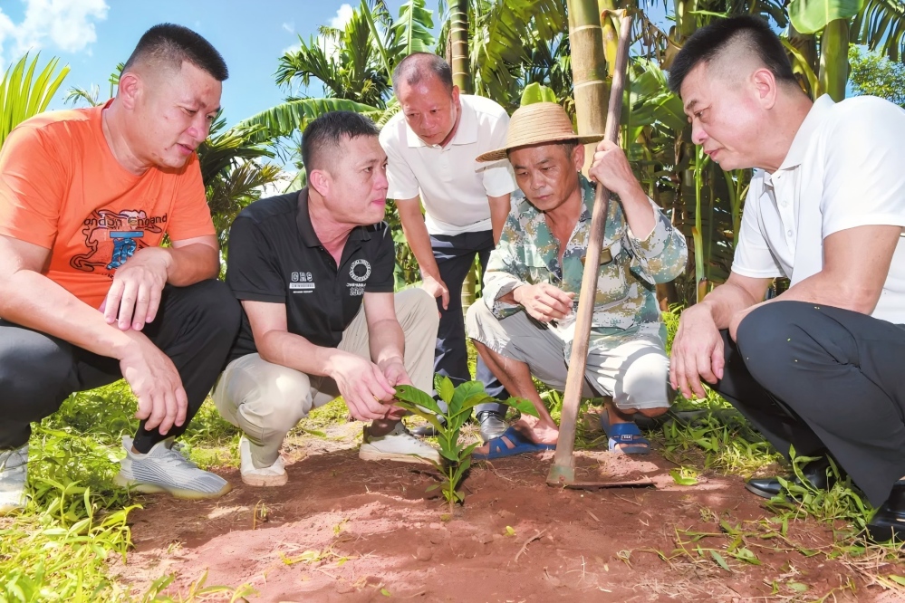 9月5日,在瓊山區紅旗鎮道崇村的檳榔地里,海南邁咖農咖啡有限公司工作人員和村民一起查看咖啡苗長勢。本報記者 蘇弼坤 攝
