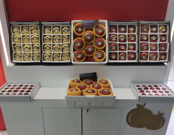 產品特色:“王鳳臺”紅富士:果面潔凈、色澤艷麗、品質優良。果實為大型果,平均單果重180-300克。果實多為扁圓形,果形指數0.8左右,少數果近圓形。果皮光滑,有光澤,中厚而韌,蠟質中多。套袋成熟果實果面鮮紅色霞或條霞。果點圓形,較明顯,中大,較密,陽面果點黃白色,陰面果點黃色。果肉黃白色,致密,細脆多汁,有清香,酸甜適口。王鳳臺蘋果可溶性固形物含量不低于14.5%,酸含量在0.2%—0.3%,果實硬度8.5kg/cm2~11kg/cm2。10月中下旬成熟既可鮮食,亦可加工成果脯、果干、罐頭、果酒及果醬等。蘋果的耐貯性非常好,貯藏后伴有香氣,可貯至翌年六月。