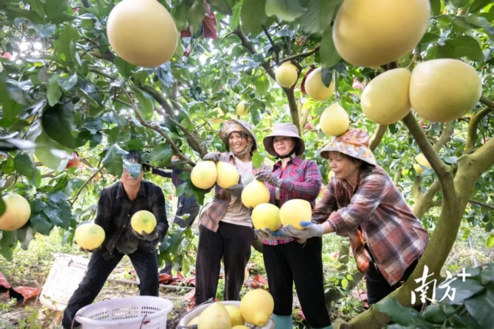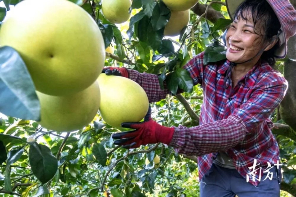果農臉上洋溢著燦爛的笑容,雙手輕柔地采摘著枝頭飽滿的柚子
