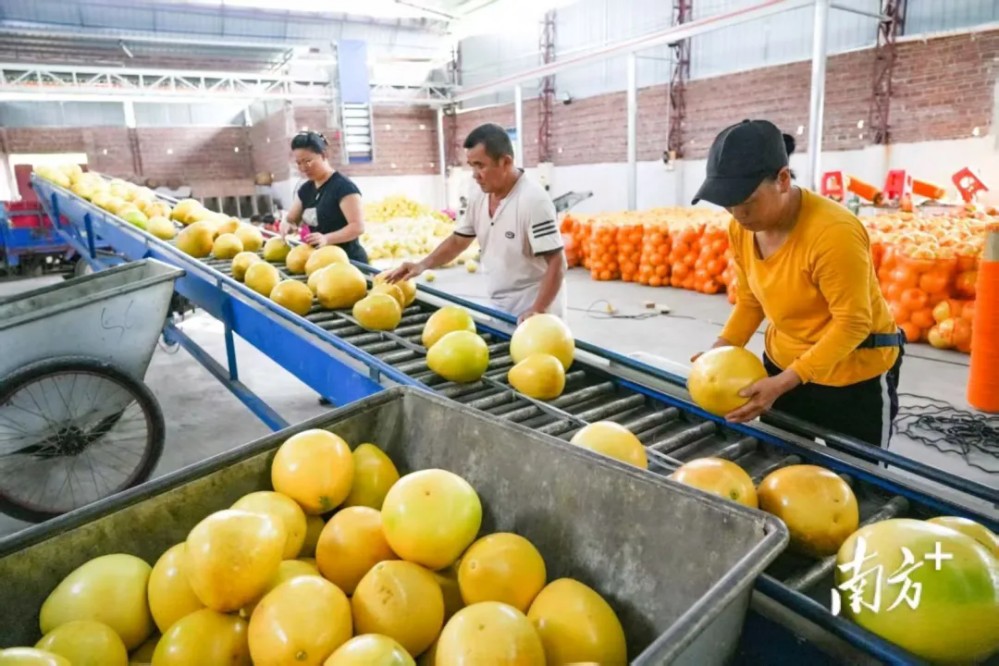 在現代化分揀線上,工人們正有序地將柚子放置在傳送帶上,進行大小、品質的篩選