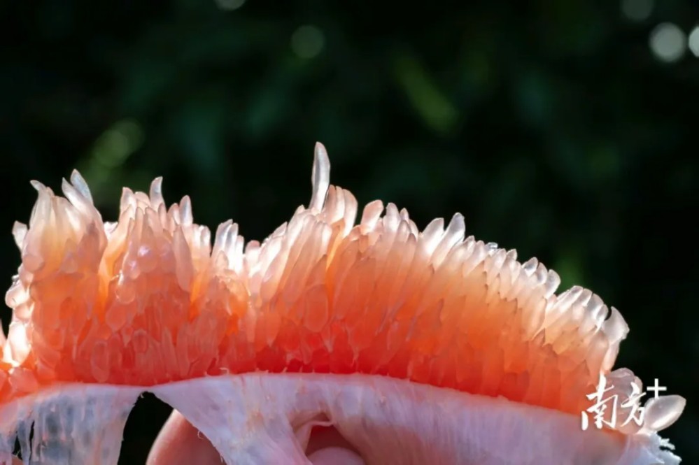 特寫鏡頭下的柚子果肉晶瑩剔透、色澤誘人