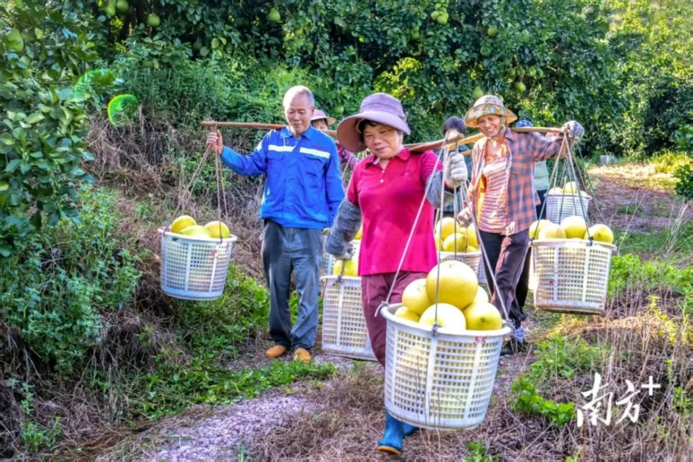 綠意盎然的柚子林中,柚農挑著柚子穿梭其間,構成了一幅生動的田園豐收圖