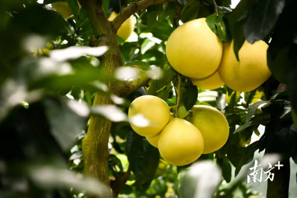 陽光透過繁茂的枝葉,照射在柚子上