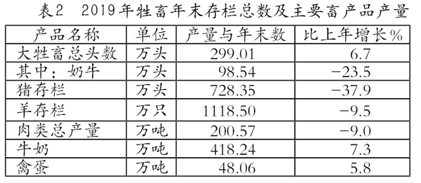畜牧業占農業總產值比重23.0%,比上年增長2.6個百分點。牲畜年末存欄總數及主要畜產品產量見表2。